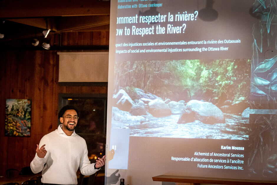 Après un repas chaud, les jeunes leaders de l’eau se sont installés pour écouter le bref discours de la Garde-rivière, Laura Reinsborough, qui a fait le tour des différents rôles à jouer en faveur de la protection de la rivière des Outaouais. Il y a eu ensuite une discussion thématique dirigée par Karim Moussa, de Future Ancestors Services. Ensemble, les leaders de l’eau ont réfléchi à la façon dont ils appliqueront les leçons tirées du programme dans leurs études, leurs carrières et leurs futurs efforts de plaidoyer. Les participants ont parlé de l’importance du leadership des jeunes, de la justice environnementale et de nos responsabilités en tant qu’ancêtres des générations futures qui habiteront un monde façonné par nos choix. Ces idées sont essentielles à un leadership inclusif et à l’établissement d’un bassin versant sain pour toutes les personnes et toutes les espèces, dans les années à venir.