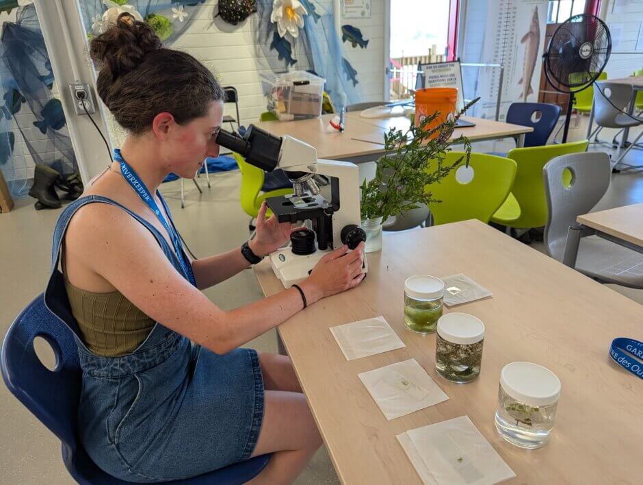 Mon poste à Garde-rivière des Outaouais était axé sur les tests de qualité de l’eau, mais j’ai également eu la chance de participer à d’autres projets et d’en tirer des enseignements. Le Labo éducatif de la Maison riveraine de la CCN a organisé plusieurs ateliers sur divers sujets, notamment les espèces envahissantes, les tortues, les proliférations algales, le sel de voirie et les liens entre les Autochtones et le bassin versant. Le fait que cet espace soit ouvert et disponible a créé une merveilleuse opportunité d’en apprendre davantage sur la science et de pouvoir la partager avec d’autres.