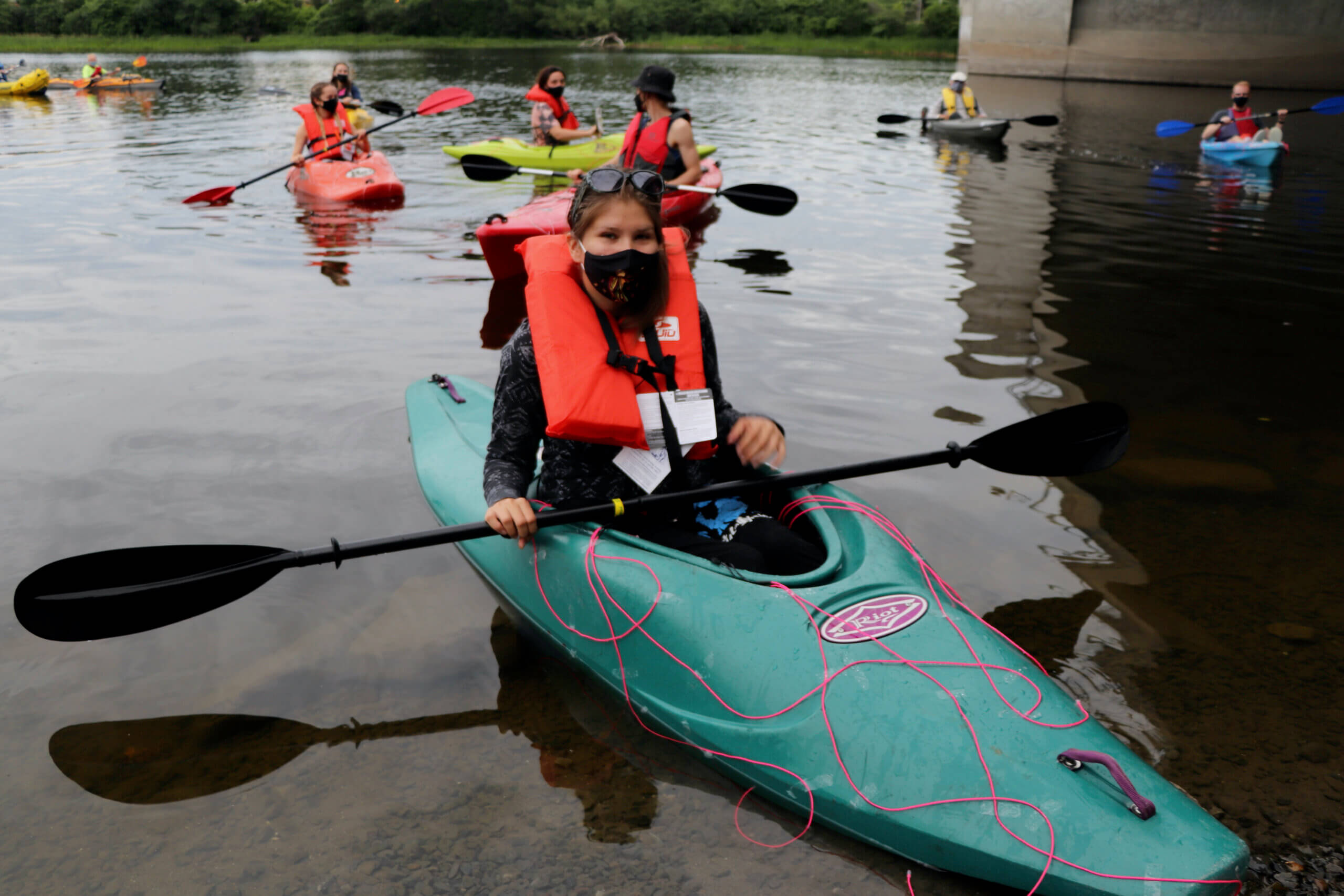 Nos JLE étaient prêts à relever le défi. Après quelques explications, ils ont mis leurs embarcations à l’eau. Certains en étaient à leur première ou deuxième expérience en kayak; d’autres, très expérimentés, ont été de bon conseil. Une fois tout le monde à l’aise dans son kayak, les jeunes ont commencé à répéter la chorégraphie nautique. Il était amusant de voir tous les kayaks aux couleurs vives faire des boucles autour des piliers du pont et se croiser sur l’eau. Après un an de confinement intermittent, cette sortie sur l’eau était une super façon de renouer avec le bassin versant, de faire de nouvelles rencontres et de développer un esprit de groupe, ne serait-ce que pour quelques heures.