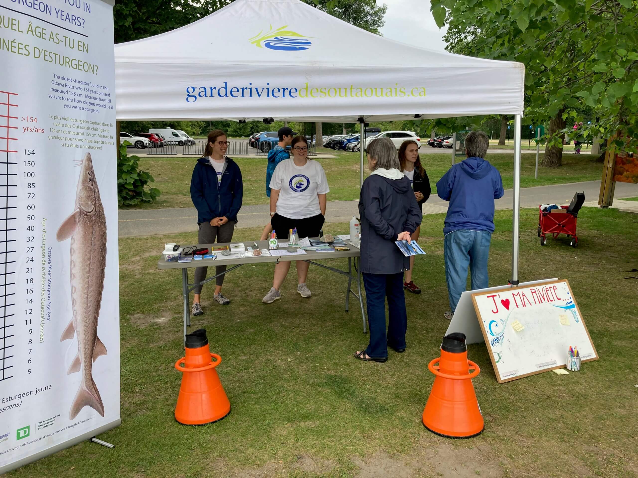 Les discussions ont aussi porté sur la santé des poissons dans notre bassin versant, les risques de contamination et les règlements sur la pêche. Les jeunes avaient beaucoup à dire sur l’esturgeon jaune, une espèce menacée dans le bassin versant. Une affiche montrant la taille d’un esturgeon selon son âge a grandement aidé à susciter l’engagement du public. Les gens ont eu beaucoup de plaisir à déterminer leur âge en années d’esturgeon.