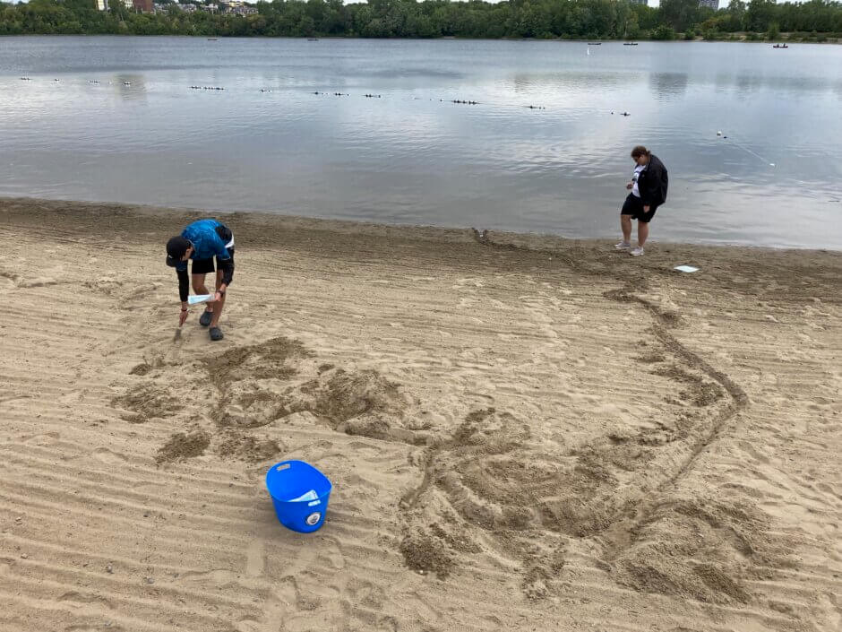 Équipée d’une quantité impressionnante de ressources, l’équipe de six jeunes a mis sur pied un kiosque pour tenter d’échanger avec les visiteurs de la plage. La journée a connu un lent départ s’expliquant par le temps frais qui a succédé brusquement à la vague de chaleur que nous avons eue dans la région. De plus, la plage était fermée à cause du manque de sauveteurs, ce qui a certainement poussé les gens à rester chez eux. Malgré tout, avant même l’heure du midi, un flot régulier de curieux s’avançaient pour rencontrer nos jeunes et en savoir plus sur l’immense carte du bassin versant qu’ils avaient tracée dans le sable de la plage.