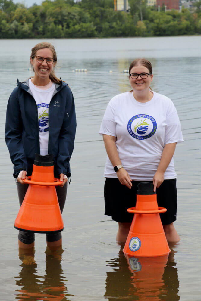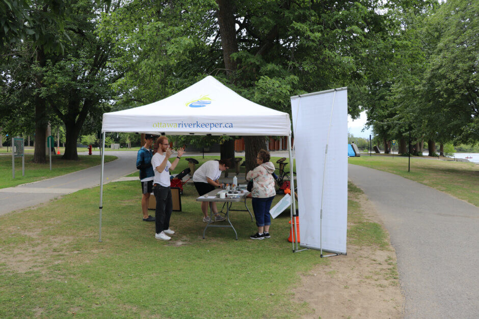 À partir de là, la journée a pris une tournure intéressante alors que les passants nous arrivaient avec des questions fort pertinentes. Parmi les thèmes abordés revenait souvent celui de la qualité de l’eau, en particulier dans les aires de baignade des environs. Les jeunes ont été en mesure de fournir des renseignements utiles sur la manière d’identifier les algues bleues toxiques dans les lacs près des chalets pour éviter de se baigner en leur présence. Ils ont également discuté de l’application Swim Guide, qui permet à Garde-rivière des Outaouais et à d’autres organismes de publier leurs plus récentes recommandations quant à la baignade selon les résultats aux tests d’E. coli. L’application comprend presque toutes les plages publiques de la région de la capitale nationale et des environs.